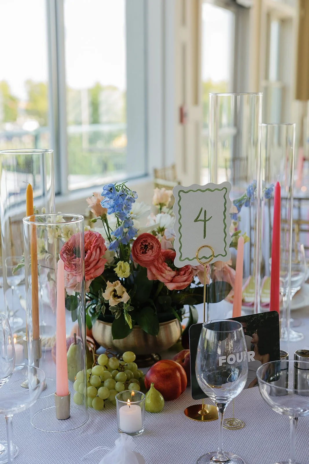 We love anchoring this space with tall candlelight and a strong floral moment that draws the eye upward and enhances the natural textures of the stone. In the Grand Ballroom, the abundance of natural light creates a beautiful backdrop, but thoughtful design is key to bringing warmth and dimension to the space.