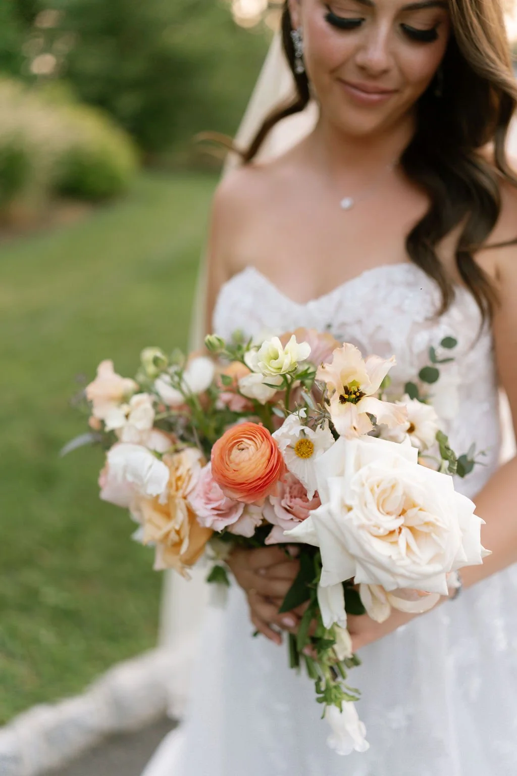 A garden-style late summer bridal bouquet featuring peach, soft orange, cream and green.
